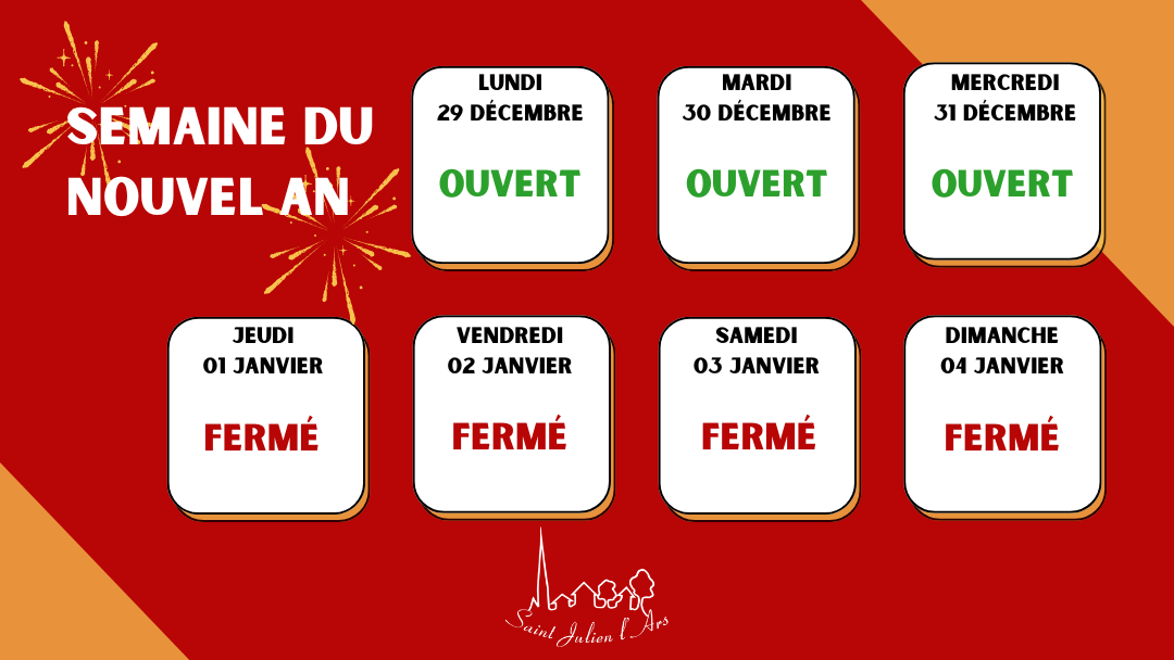 Nous vous informons qu’à l’occasion des fêtes de fin d’année, les jours d’ouverture de la mairie seront modifiés exceptionnellement. Les horaires restent inchangés, nous vous accueillons de 9h à 12h en matinée, puis de 14h à 17h l’après-midi.