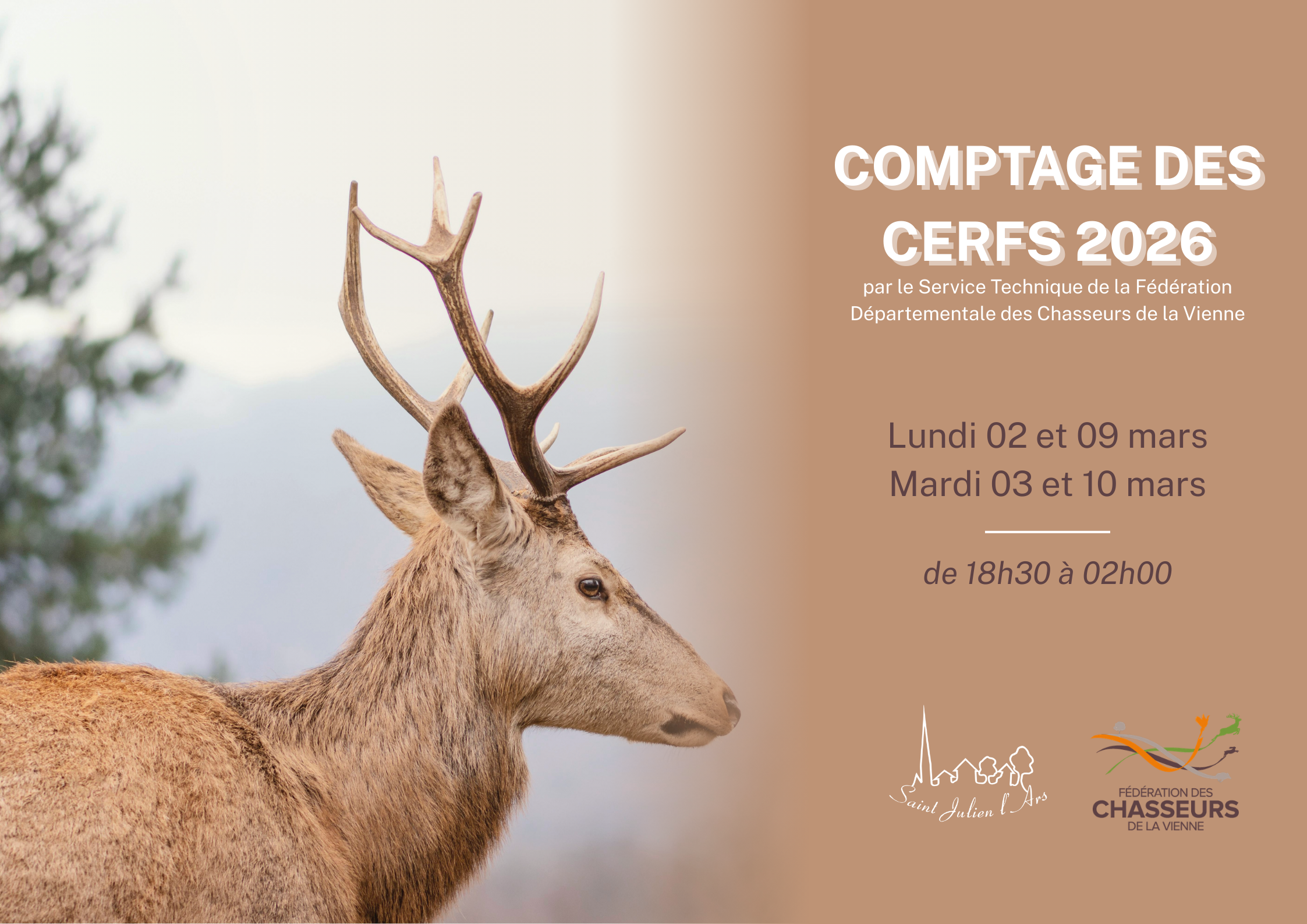 Dans le cadre des suivis de populations de gibier, des comptages de cerfs seront effectués sur notre commune, au moyen de sources lumineuses, par le Service Technique de la Fédération Départementale des Chasseurs de la Vienne.