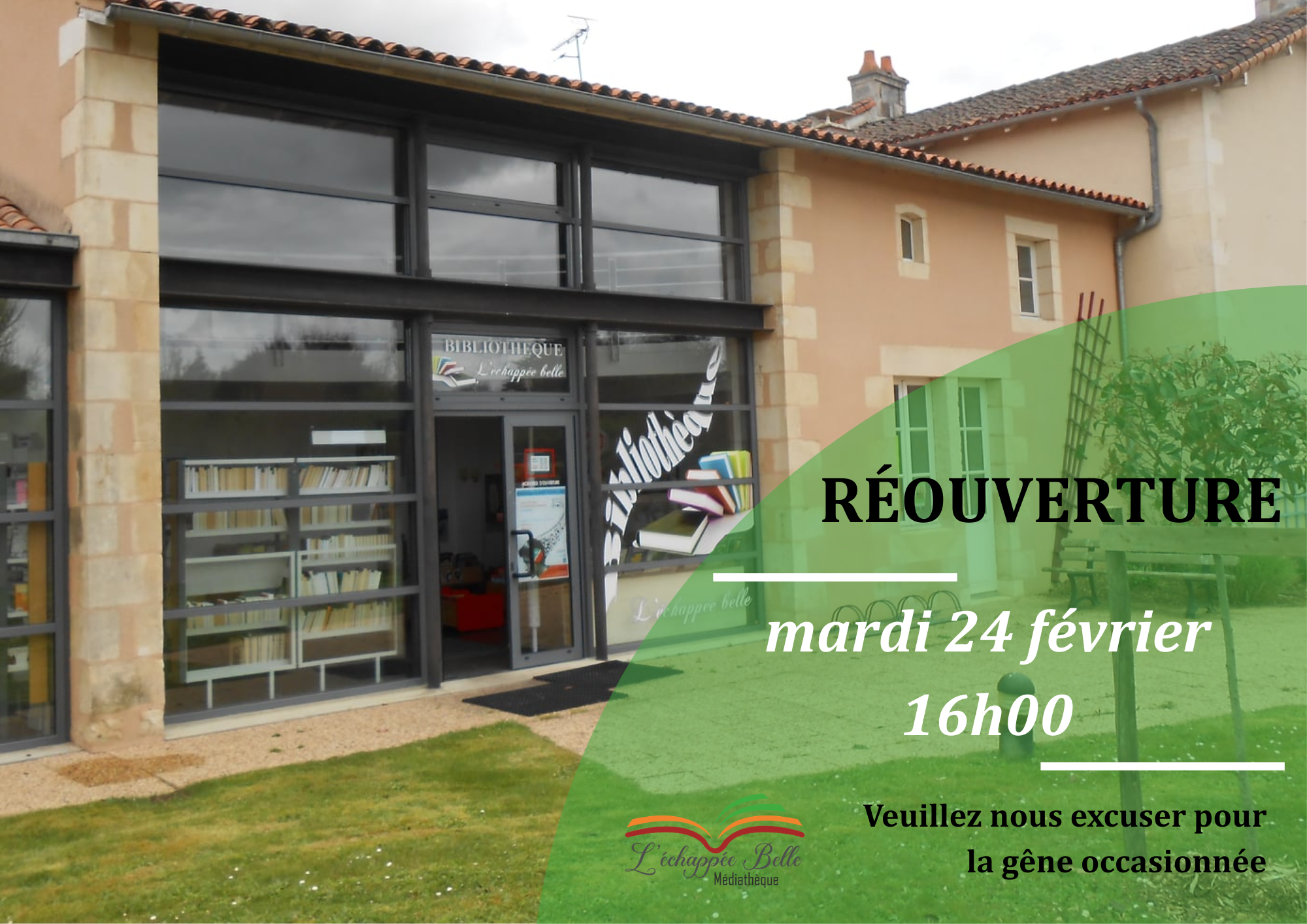 La Médiathèque L‘Échappée Belle réouvre à partir de mardi 24 février 2026, à 16h00.