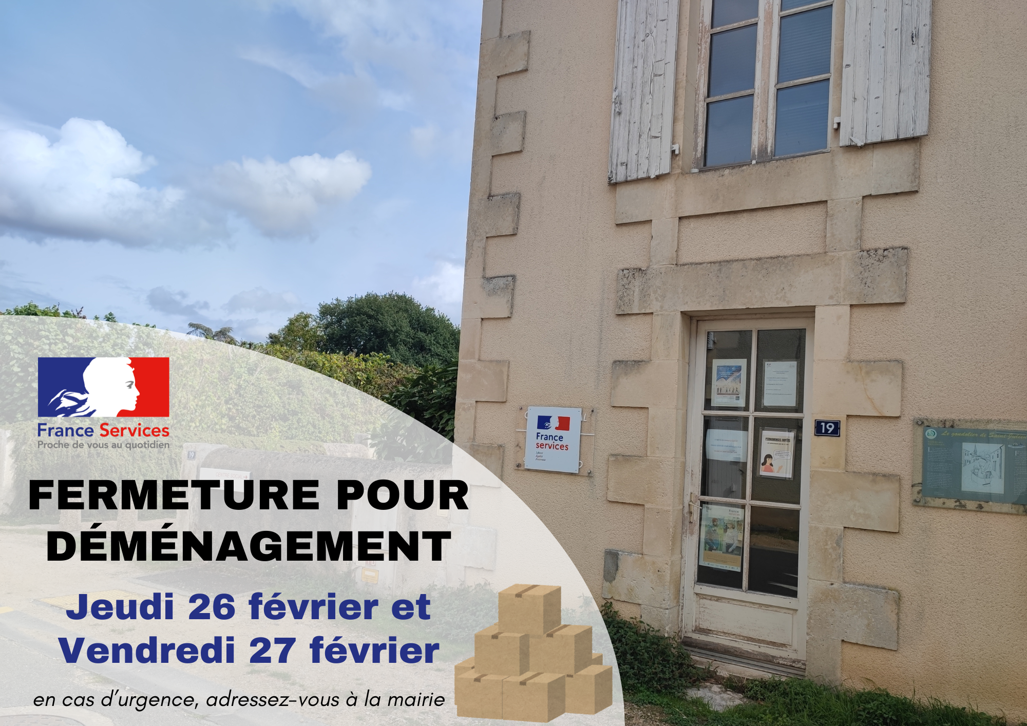 En raison du déménagement des locaux de France Services, le service sera fermé jeudi 26 et vendredi 27 février 2026.
